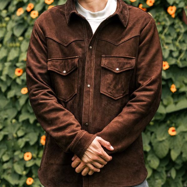 Camisa de piel para caballero, con corte recto, bolsillos frontales y cierre de botones al frente; estilo moderno y versátil.